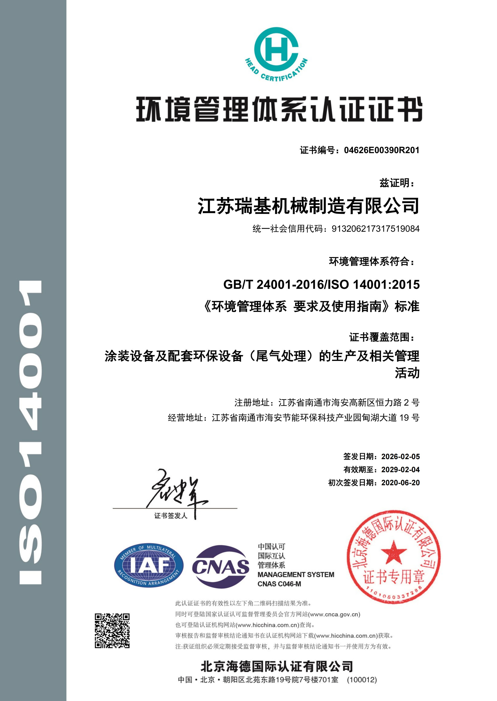 環(huán)境管理體系認(rèn)證證書